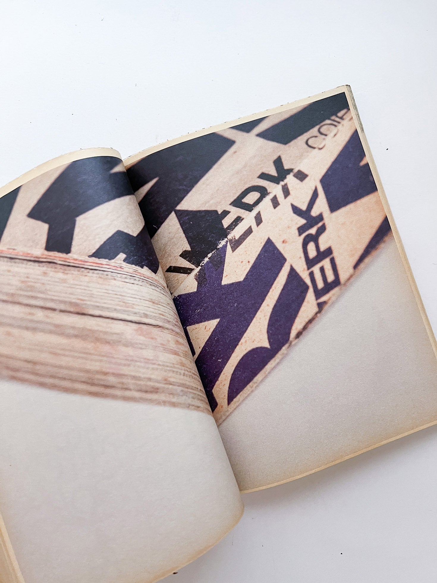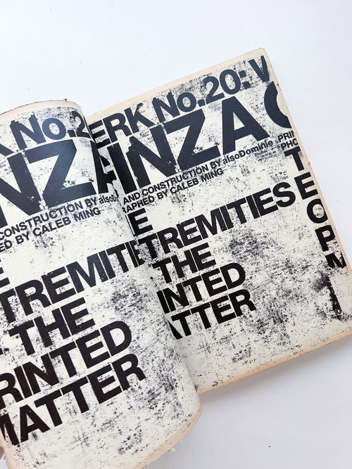 シンガポールのデザイナー、テセウス・チャン(Theseus Chan)による雑誌『WERK』。ギンザ・グラフィック・ギャラリーでの展覧会に合わせて刊行された第20号。「新しい精神を象徴するために、本当に古いものを求めた」というテセウスの言葉通り、古書のような特殊なエイジング加工が施されています。本書では、これまで刊行されてきたWERK各号の細部を収録し、紙の繊維、製本の構造、インクの染みといった、普段は肉眼で見過ごされてしまう印刷物のディテールを極限まで拡大して見せることで、本や雑誌という媒体が持つ物質的な美しさを改めて提示しています。