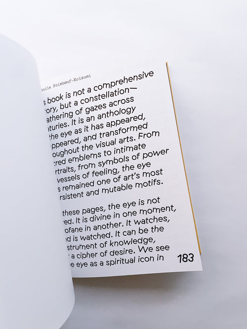 Following Jeux de mains, the first collaboration between Cécile Poimboeuf-Koizumi — publisher, curator and co-founder of Chose Commune — and Stephen Ellcock —  curator, writer, researcher, and online collector of images — this second volume focuses on the motif of the eye in art. Present across all cultures and eras, the eye fascinates with its rich symbolism: spiritual, political, intimate, or mysterious. From Antiquity to contemporary art, over a hundred images, selected intuitively and without chronological order, form this visual constellation. This book celebrates the diversity of artistic perspectives on this small organ that has, over time, become a powerful universal symbol.