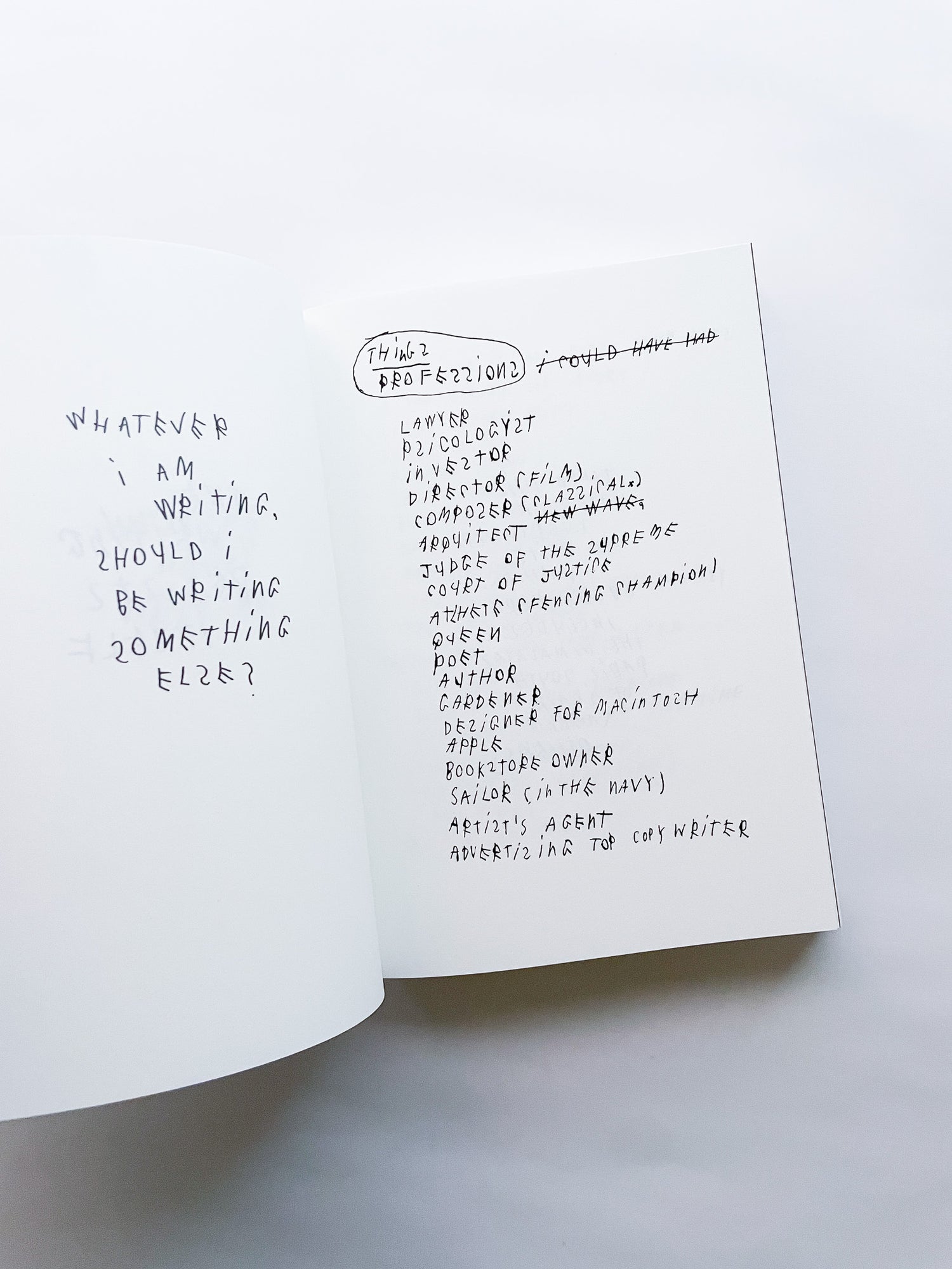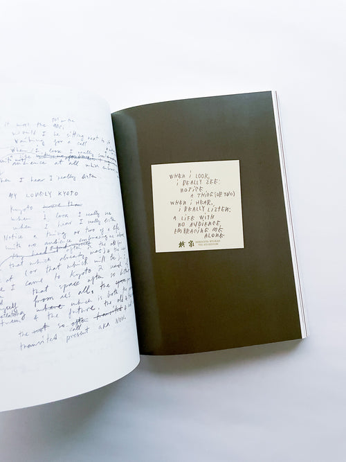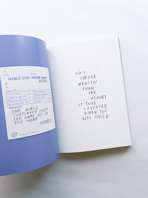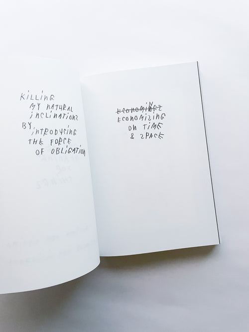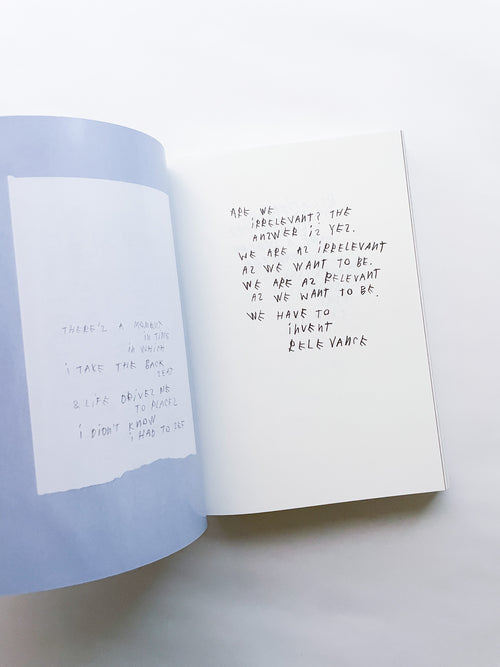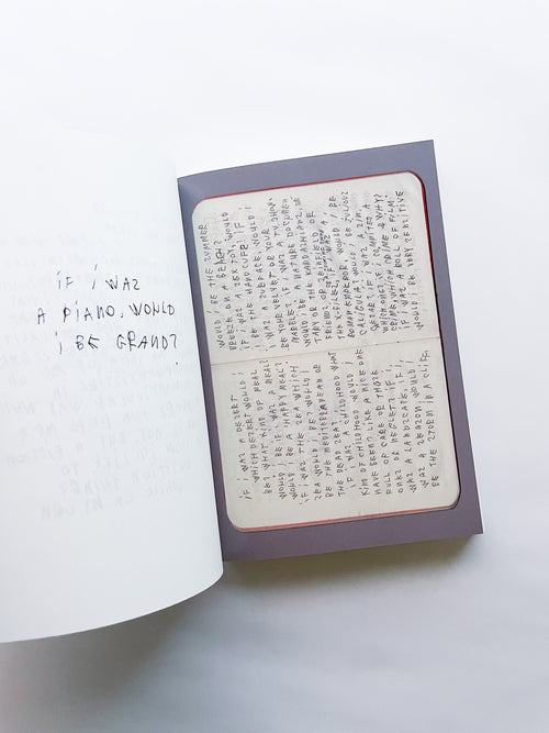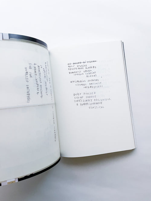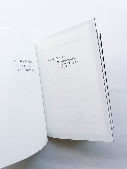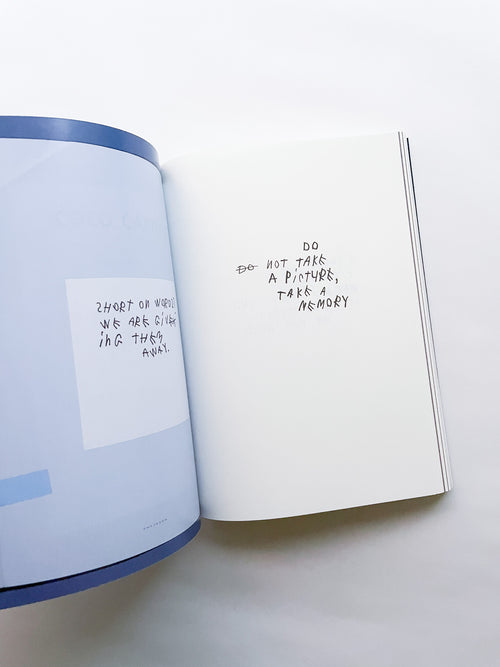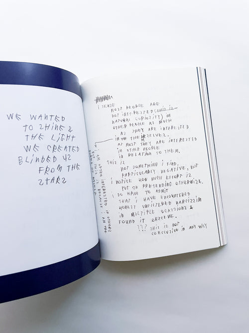 写真家として数々のブランドやファッション誌との協働で知られる一方、手書きのテキストもまた、写真と同じくらい作家にとって重要な作品として位置づけられています。独特の筆致で綴られる言葉は、現代社会への鋭い風刺や懐疑、あるいは個人的な不安や孤独を内包しています。 本作は、作者の皮肉と親密さが入り混じる、束の間の思考の断片を集めたものです。近年のテキストに加え、書き留められた実際の紙片やナプキンなど、元の素材がフルカラーで収録されています。その瞬間に捉えられたものであれ、詩として推敲されたものであれ、言葉は走り書きされ、線で消され、丸で囲まれ、下線が引かれ、時には日付や見出しが添えられることで、それらが綴られた時間と場所を明らかにしています。396ページという辞書のようなボリュームでありながら、親密な日記を覗き見るような軽やかな造本も魅力です。