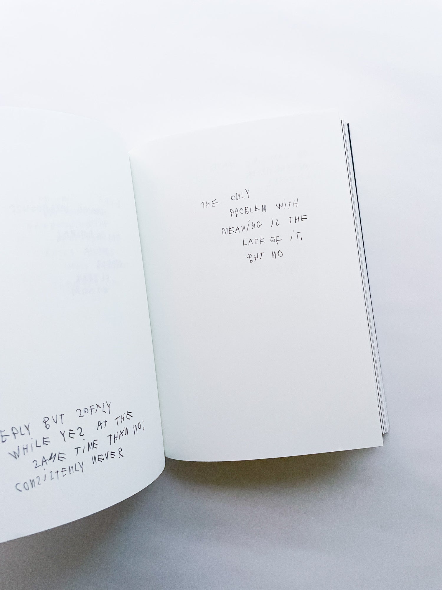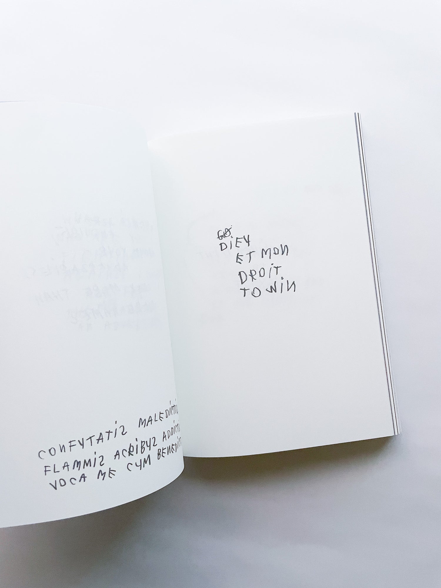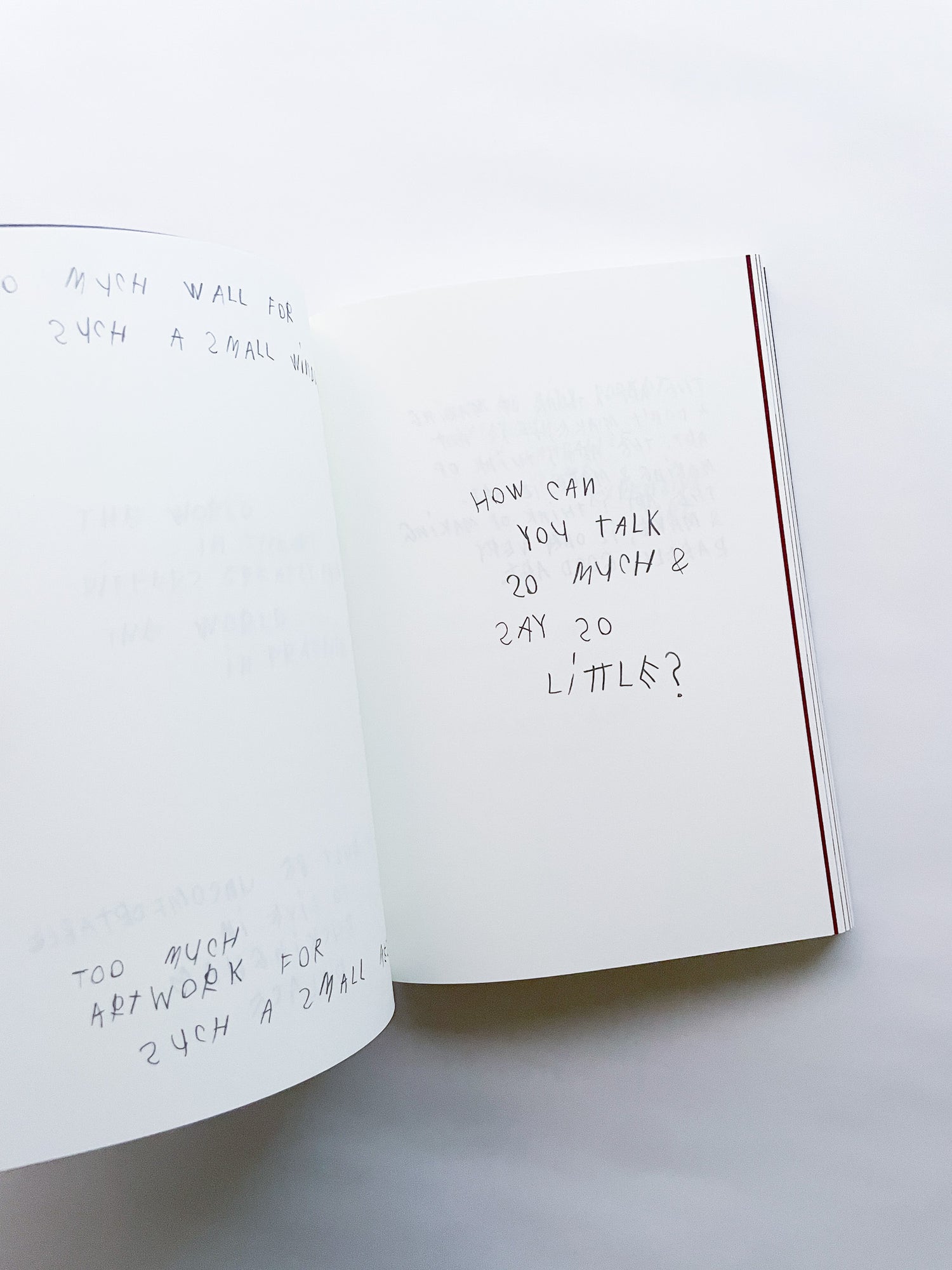 写真家として数々のブランドやファッション誌との協働で知られる一方、手書きのテキストもまた、写真と同じくらい作家にとって重要な作品として位置づけられています。独特の筆致で綴られる言葉は、現代社会への鋭い風刺や懐疑、あるいは個人的な不安や孤独を内包しています。 本作は、作者の皮肉と親密さが入り混じる、束の間の思考の断片を集めたものです。近年のテキストに加え、書き留められた実際の紙片やナプキンなど、元の素材がフルカラーで収録されています。その瞬間に捉えられたものであれ、詩として推敲されたものであれ、言葉は走り書きされ、線で消され、丸で囲まれ、下線が引かれ、時には日付や見出しが添えられることで、それらが綴られた時間と場所を明らかにしています。396ページという辞書のようなボリュームでありながら、親密な日記を覗き見るような軽やかな造本も魅力です。