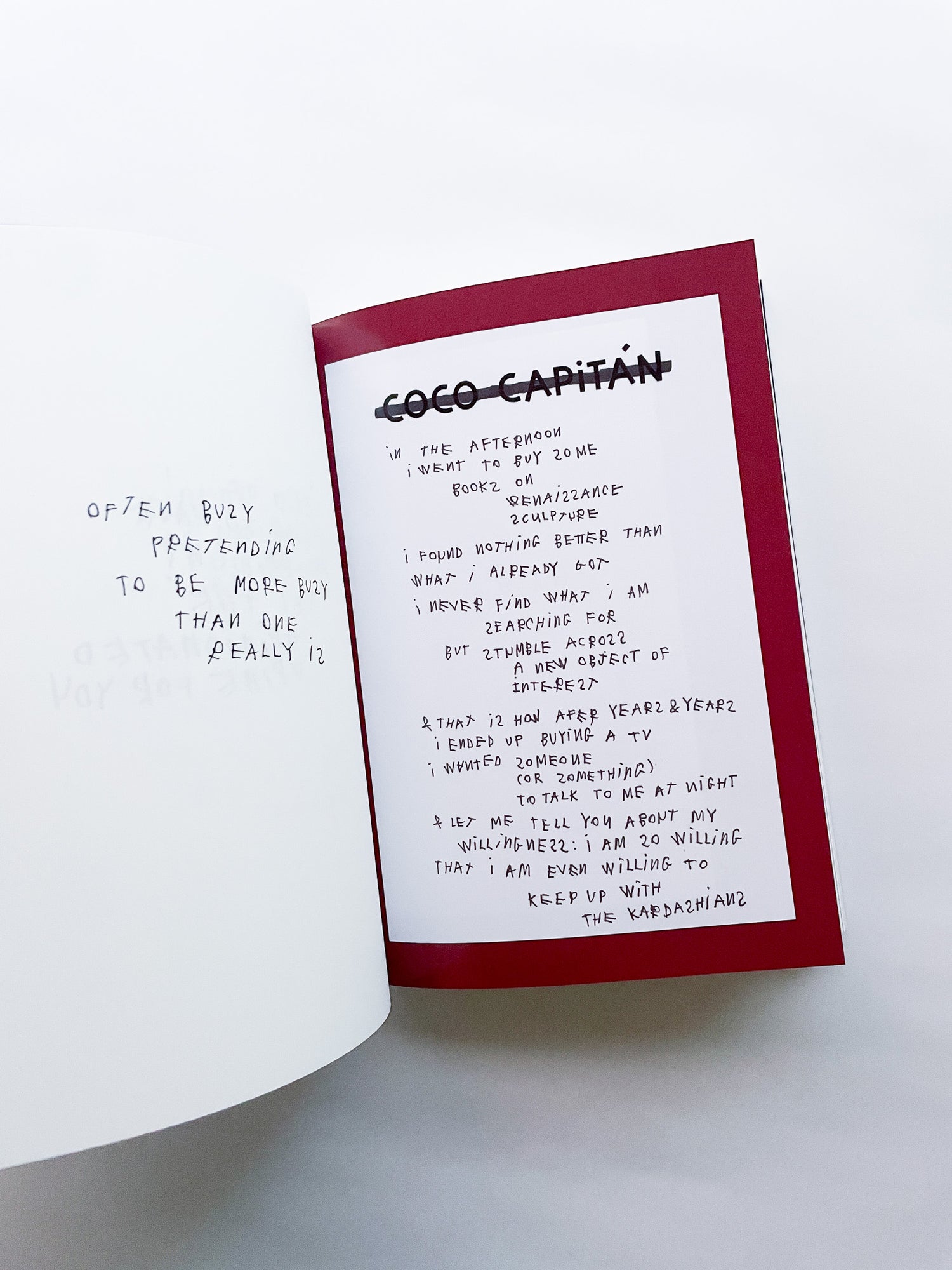 Coco Capitan continues her exploration of writing as a vital gesture. Words on Paper brings together her ironic and intimate aphorisms — delicate fragments of fleeting thoughts.